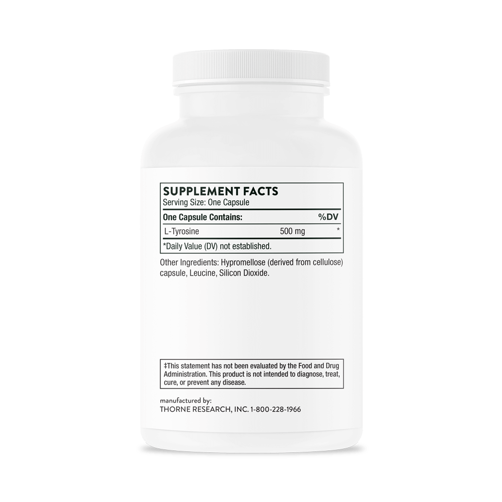 L-tyrosine plays an important role in the central nervous system, the thyroid, and the adrenal glands.* It is an amino acid precursor for the synthesis of the brain-friendly neurotransmitters norepinephrine and dopamine.* By improving the rate of neurotransmitter production and stimulating the central nervous system, L-tyrosine helps relieve the physical symptoms of stress, such as mood swings. Chronically stressed individuals might not efficiently convert phenylalanine to tyrosine, which makes supplementation with L-tyrosine desirable.* L-tyrosine also serves as a precursor for the thyroid hormone thyroxine and for melanin, the pigment that protects against harmful ultraviolet rays.* L-tyrosine stimulates growth hormone, is involved in adrenal and pituitary function, and is a powerful antioxidant, neutralizing free radicals and inhibiting fat oxidation.*