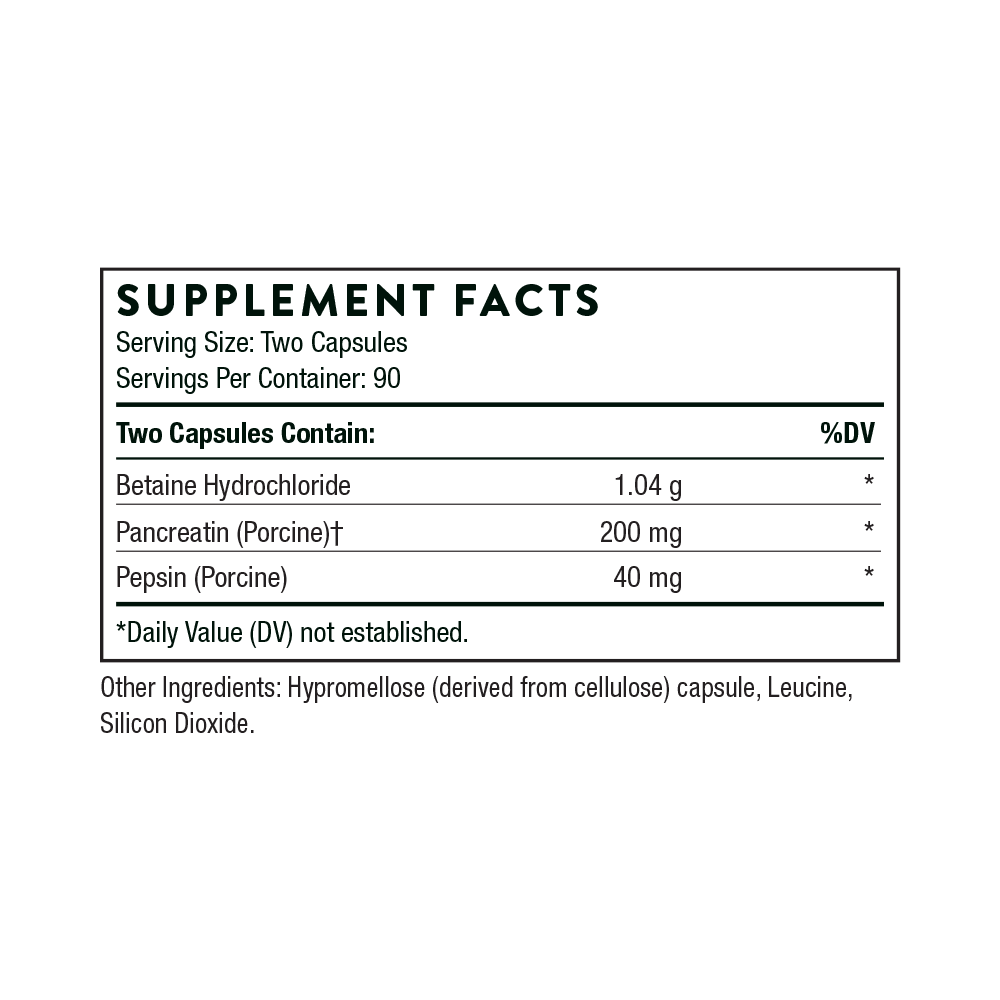HCl facilitates the body’s absorption of multiple nutrients, including folate, vitamin B12, vitamin C, beta-carotene, iron, and various forms of calcium, magnesium, and zinc.* Pancreatic enzymes facilitate the absorption of fat-soluble nutrients like vitamins A, D, E, and K, CoQ10, and omega-3 fatty acids.*